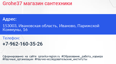 Grohe37, магазин сантехники по адресу 153003, Ивановская область, Иваново, Парижской Коммуны, 16 в дальнейшем Организация, размещена в следующих категориях: