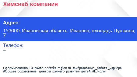 Химснаб, компания по адресу 153000, Ивановская область, Иваново, площадь Пушкина, 7 в дальнейшем Организация, размещена в следующих категориях: