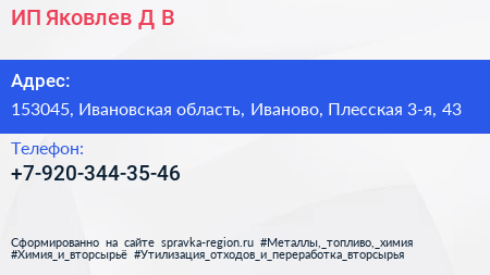 ИП Яковлев Д.В. по адресу 153045, Ивановская область, Иваново, Плесская 3-я, 43 в дальнейшем Организация, размещена в следующих категориях:
