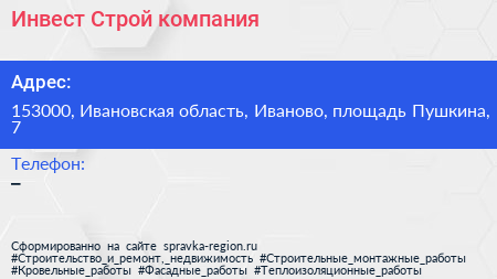 Инвест Строй, компания по адресу 153000, Ивановская область, Иваново, площадь Пушкина, 7 в дальнейшем Организация, размещена в следующих категориях: