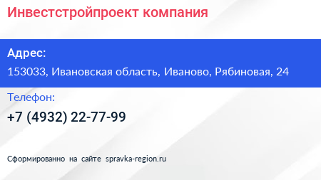 Инвестстройпроект, компания по адресу 153033, Ивановская область, Иваново, Рябиновая, 24 в дальнейшем Организация, размещена в следующих категориях: