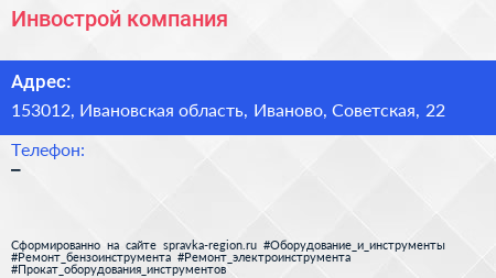 Инвострой, компания по адресу 153012, Ивановская область, Иваново, Советская, 22 в дальнейшем Организация, размещена в следующих категориях: