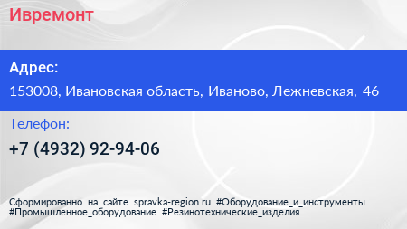 Ивремонт по адресу 153008, Ивановская область, Иваново, Лежневская, 46 в дальнейшем Организация, размещена в следующих категориях: