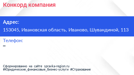 Конкорд, компания по адресу 153045, Ивановская область, Иваново, Шувандиной, 113 в дальнейшем Организация, размещена в следующих категориях:
