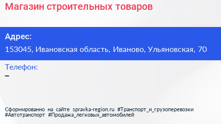 Магазин строительных товаров по адресу 153045, Ивановская область, Иваново, Ульяновская, 70 в дальнейшем Организация, размещена в следующих категориях: