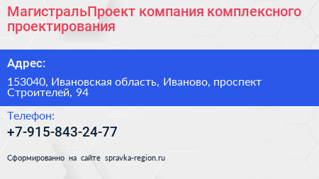 МагистральПроект, компания комплексного проектирования по адресу 153040, Ивановская область, Иваново, проспект Строителей, 94 в дальнейшем Организация, размещена в следующих категориях: