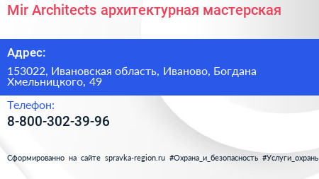 Mir Architects, архитектурная мастерская по адресу 153022, Ивановская область, Иваново, Богдана Хмельницкого, 49 в дальнейшем Организация, размещена в следующих категориях: