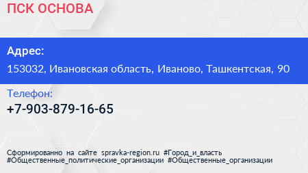 ПСК-ОСНОВА по адресу 153032, Ивановская область, Иваново, Ташкентская, 90 в дальнейшем Организация, размещена в следующих категориях: