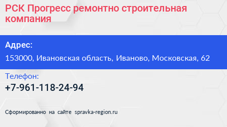 РСК Прогресс, ремонтно-строительная компания по адресу 153000, Ивановская область, Иваново, Московская, 62 в дальнейшем Организация, размещена в следующих категориях: