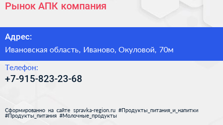 Рынок АПК, компания по адресу Ивановская область, Иваново, Окуловой, 70м в дальнейшем Организация, размещена в следующих категориях: