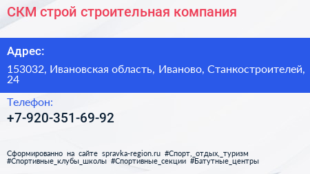 СКМ-строй, строительная компания по адресу 153032, Ивановская область, Иваново, Станкостроителей, 24 в дальнейшем Организация, размещена в следующих категориях: