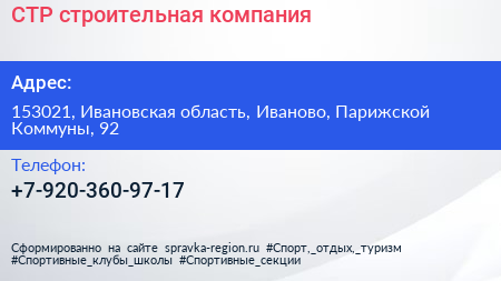 СТР, строительная компания по адресу 153021, Ивановская область, Иваново, Парижской Коммуны, 92 в дальнейшем Организация, размещена в следующих категориях: