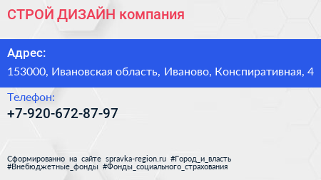 СТРОЙ-ДИЗАЙН, компания по адресу 153000, Ивановская область, Иваново, Конспиративная, 4 в дальнейшем Организация, размещена в следующих категориях: