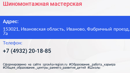 Шиномонтажная мастерская по адресу 153021, Ивановская область, Иваново, Фабричный проезд, 7а в дальнейшем Организация, размещена в следующих категориях: