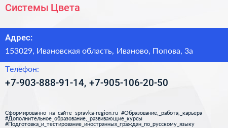 Системы Цвета по адресу 153029, Ивановская область, Иваново, Попова, 3а в дальнейшем Организация, размещена в следующих категориях: