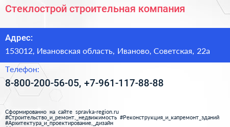 Стеклострой, строительная компания по адресу 153012, Ивановская область, Иваново, Советская, 22а в дальнейшем Организация, размещена в следующих категориях: