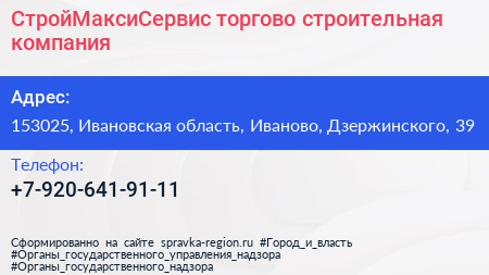 СтройМаксиСервис, торгово-строительная компания по адресу 153025, Ивановская область, Иваново, Дзержинского, 39 в дальнейшем Организация, размещена в следующих категориях: