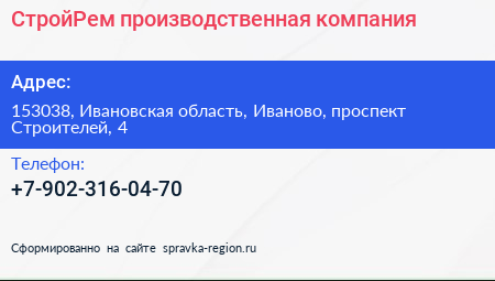 СтройРем, производственная компания по адресу 153038, Ивановская область, Иваново, проспект Строителей, 4 в дальнейшем Организация, размещена в следующих категориях: