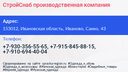 СтройСнаб, производственная компания по адресу 153012, Ивановская область, Иваново, Сакко, 43 в дальнейшем Организация, размещена в следующих категориях: