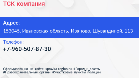 ТСК, компания по адресу 153045, Ивановская область, Иваново, Шувандиной, 113 в дальнейшем Организация, размещена в следующих категориях: