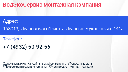 ВодЭкоСервис, монтажная компания по адресу 153013, Ивановская область, Иваново, Куконковых, 141а в дальнейшем Организация, размещена в следующих категориях: