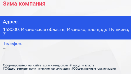 Зима, компания по адресу 153000, Ивановская область, Иваново, площадь Пушкина, 7 в дальнейшем Организация, размещена в следующих категориях:
