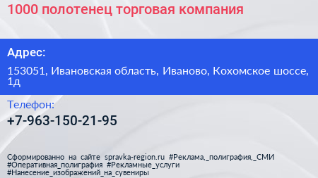 1000 полотенец, торговая компания по адресу 153051, Ивановская область, Иваново, Кохомское шоссе, 1д в дальнейшем Организация, размещена в следующих категориях: