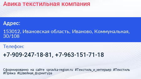 Авика, текстильная компания по адресу 153012, Ивановская область, Иваново, Коммунальная, 30/108 в дальнейшем Организация, размещена в следующих категориях: