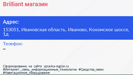 Brilliant, магазин по адресу 153051, Ивановская область, Иваново, Кохомское шоссе, 1д в дальнейшем Организация, размещена в следующих категориях:
