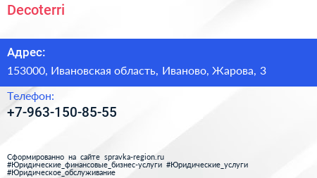 Decoterri по адресу 153000, Ивановская область, Иваново, Жарова, 3 в дальнейшем Организация, размещена в следующих категориях: