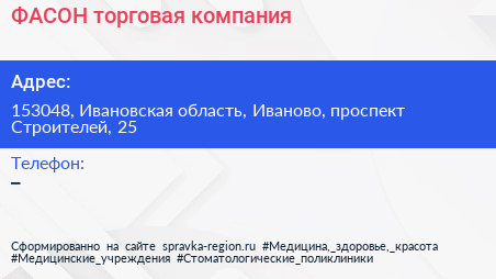 ФАСОН, торговая компания по адресу 153048, Ивановская область, Иваново, проспект Строителей, 25 в дальнейшем Организация, размещена в следующих категориях: