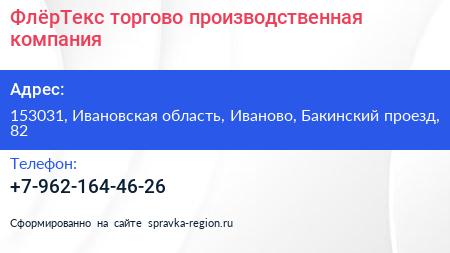 ФлёрТекс, торгово-производственная компания по адресу 153031, Ивановская область, Иваново, Бакинский проезд, 82 в дальнейшем Организация, размещена в следующих категориях: