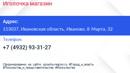 Иголочка, магазин по адресу 153037, Ивановская область, Иваново, 8 Марта, 32 в дальнейшем Организация, размещена в следующих категориях: