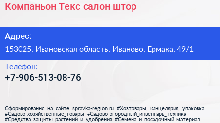 Компаньон-Текс, салон штор по адресу 153025, Ивановская область, Иваново, Ермака, 49/1 в дальнейшем Организация, размещена в следующих категориях:
