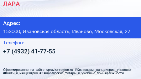 ЛАРА по адресу 153000, Ивановская область, Иваново, Московская, 27 в дальнейшем Организация, размещена в следующих категориях: