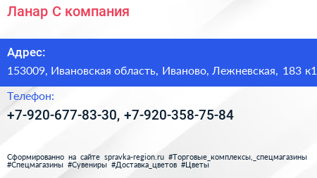 Ланар+С, компания по адресу 153009, Ивановская область, Иваново, Лежневская, 183 к1 в дальнейшем Организация, размещена в следующих категориях:
