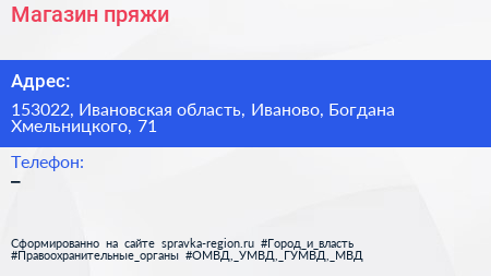 Магазин пряжи по адресу 153022, Ивановская область, Иваново, Богдана Хмельницкого, 71 в дальнейшем Организация, размещена в следующих категориях: