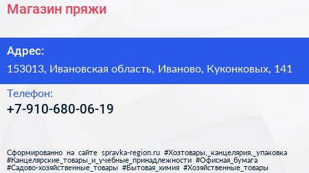 Магазин пряжи по адресу 153013, Ивановская область, Иваново, Куконковых, 141 в дальнейшем Организация, размещена в следующих категориях: