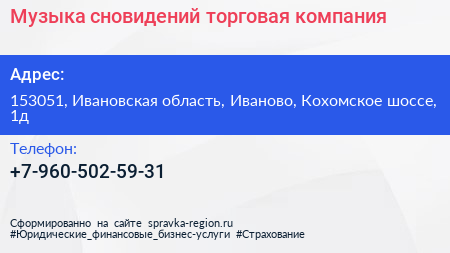 Музыка сновидений, торговая компания по адресу 153051, Ивановская область, Иваново, Кохомское шоссе, 1д в дальнейшем Организация, размещена в следующих категориях: