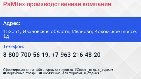 PaMtex, производственная компания по адресу 153051, Ивановская область, Иваново, Кохомское шоссе, 1д в дальнейшем Организация, размещена в следующих категориях: