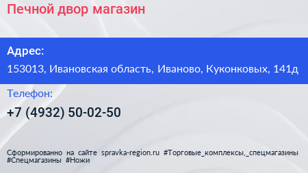 Печной двор, магазин по адресу 153013, Ивановская область, Иваново, Куконковых, 141д в дальнейшем Организация, размещена в следующих категориях: