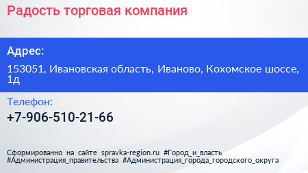 Радость, торговая компания по адресу 153051, Ивановская область, Иваново, Кохомское шоссе, 1д в дальнейшем Организация, размещена в следующих категориях: