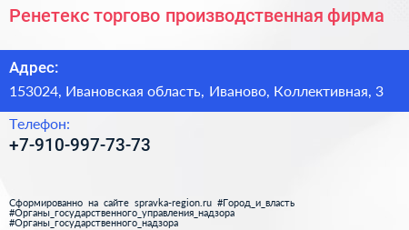 Ренетекс, торгово-производственная фирма по адресу 153024, Ивановская область, Иваново, Коллективная, 3 в дальнейшем Организация, размещена в следующих категориях:
