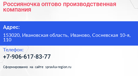 Россияночка, оптово-производственная компания по адресу 153020, Ивановская область, Иваново, Сосневская 10-я, 110 в дальнейшем Организация, размещена в следующих категориях: