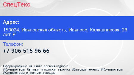 СпецТекс по адресу 153024, Ивановская область, Иваново, Калашникова, 28 лит Р в дальнейшем Организация, размещена в следующих категориях:
