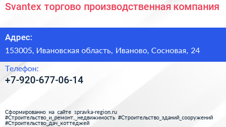 Svantex, торгово-производственная компания по адресу 153005, Ивановская область, Иваново, Сосновая, 24 в дальнейшем Организация, размещена в следующих категориях: