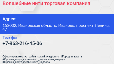 Волшебные нити, торговая компания по адресу 153002, Ивановская область, Иваново, проспект Ленина, 47 в дальнейшем Организация, размещена в следующих категориях:
