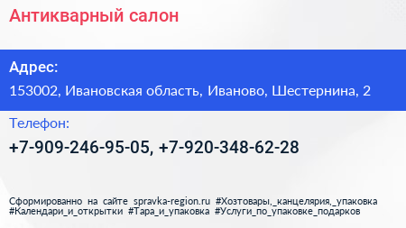 Антикварный салон по адресу 153002, Ивановская область, Иваново, Шестернина, 2 в дальнейшем Организация, размещена в следующих категориях: