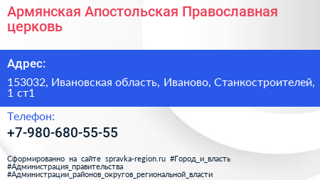 Армянская Апостольская Православная церковь по адресу 153032, Ивановская область, Иваново, Станкостроителей, 1 ст1 в дальнейшем Организация, размещена в следующих категориях: