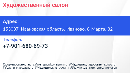 Художественный салон по адресу 153037, Ивановская область, Иваново, 8 Марта, 32 в дальнейшем Организация, размещена в следующих категориях: